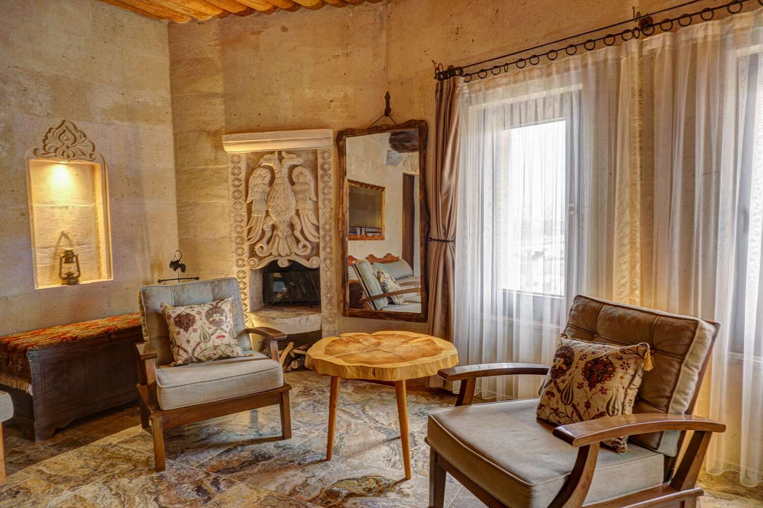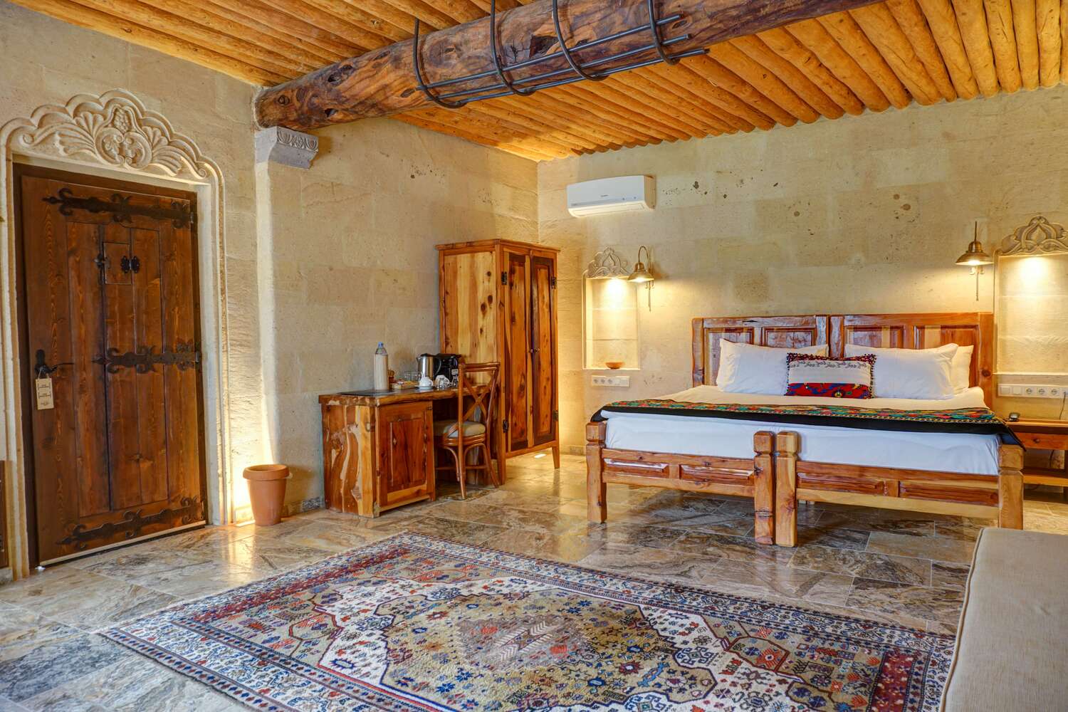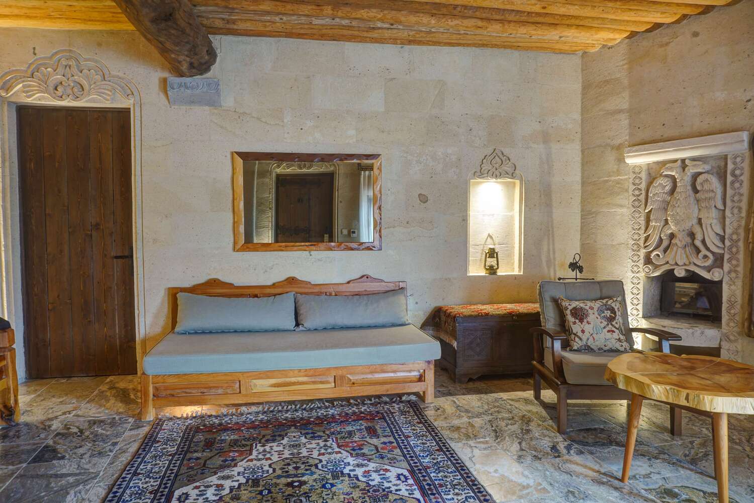 The King Suite offers an elegant and spacious setting with high ceilings, natural stone walls, and a private sitting area—bringing a royal touch to your stay.