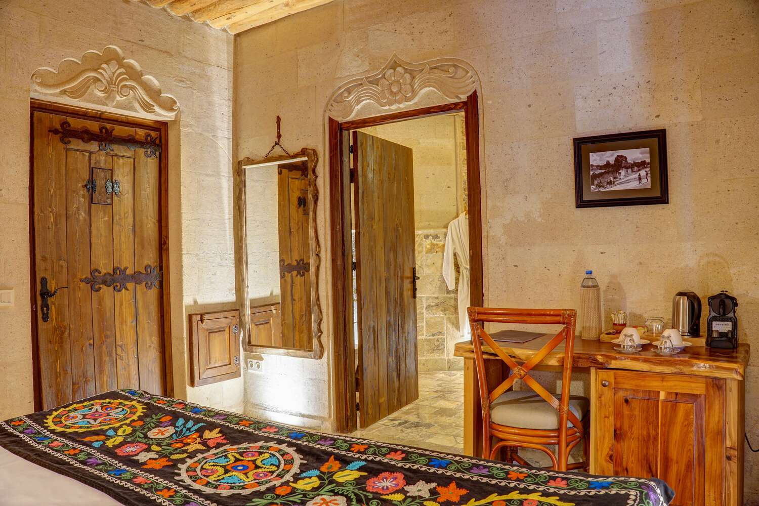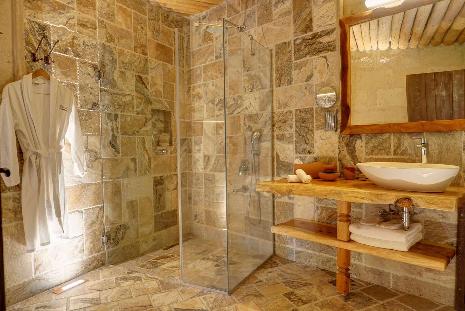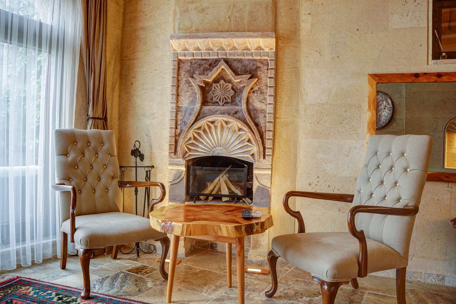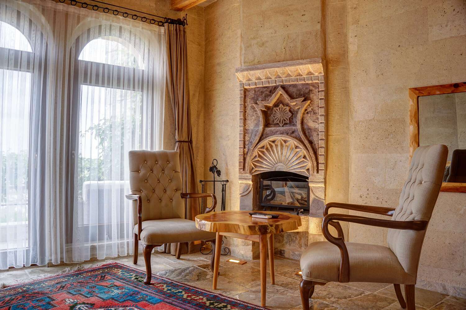 The King Suite offers an elegant and spacious setting with high ceilings, natural stone walls, and a private sitting area—bringing a royal touch to your stay